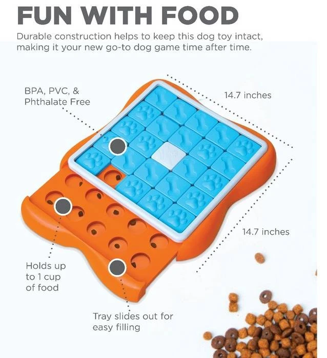 Le jeu Challenge Slider encourage le jeu libre pour trouver des friandises ! Commencez par remplir les compartiments de friandises ou de nourriture sèche. Encouragez ensuite votre animal à explorer le jouet.